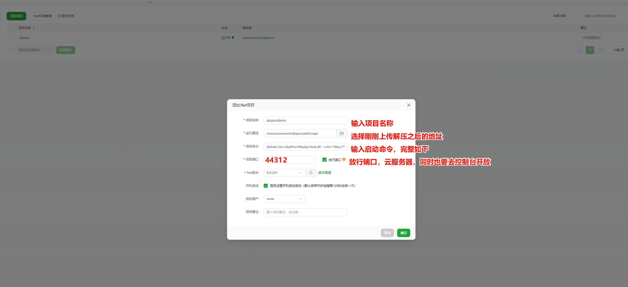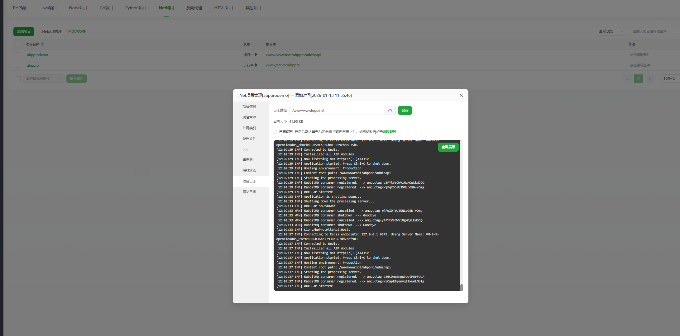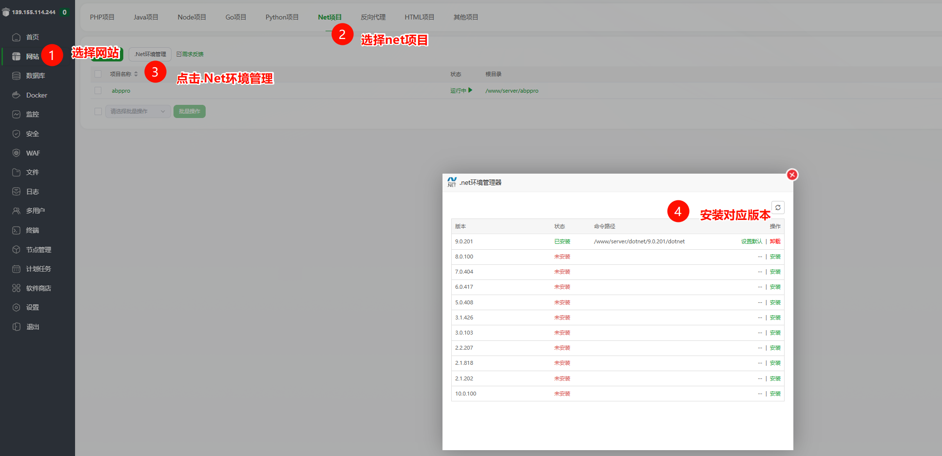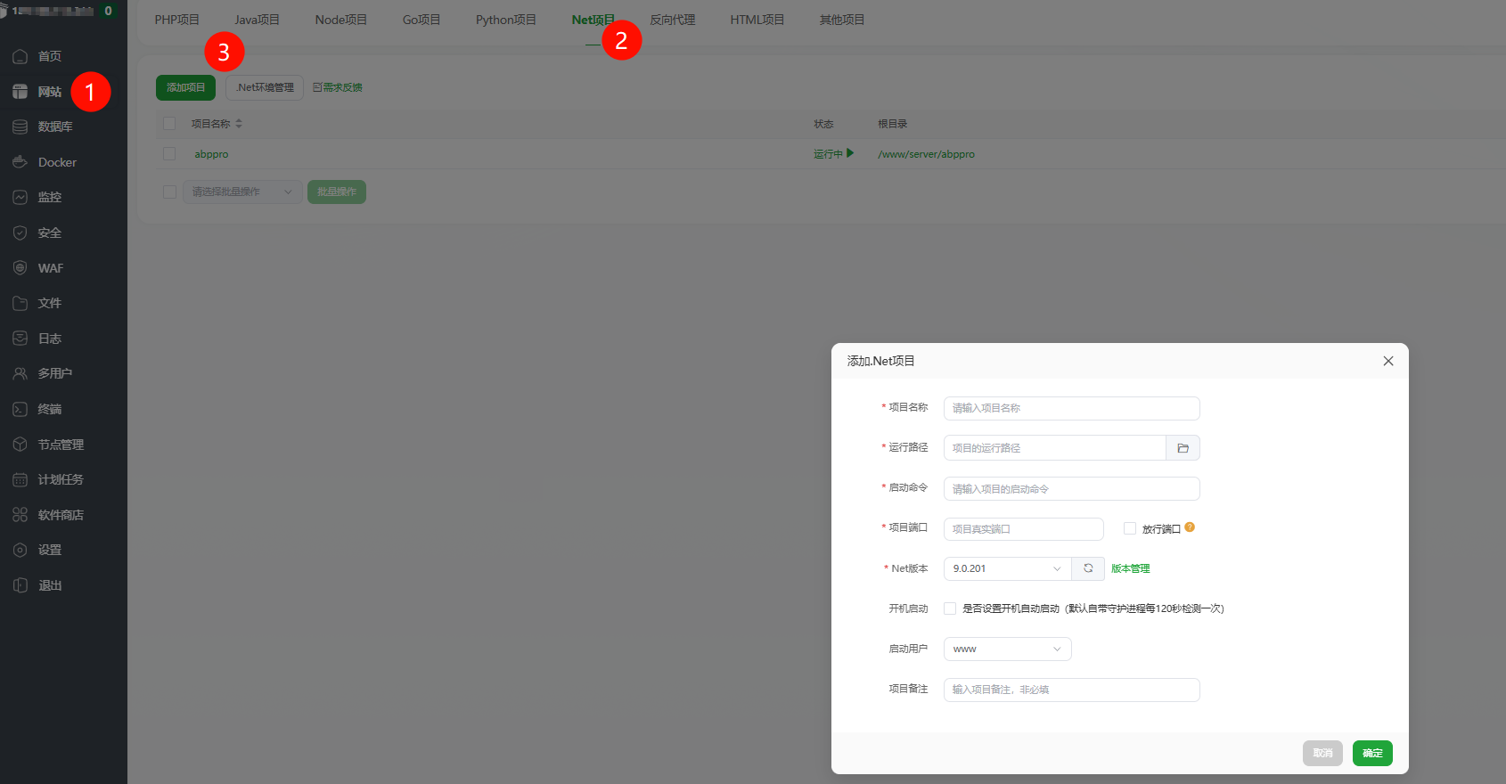 - 点击左侧菜单“网站”,选择Net项目,点击新建项目
