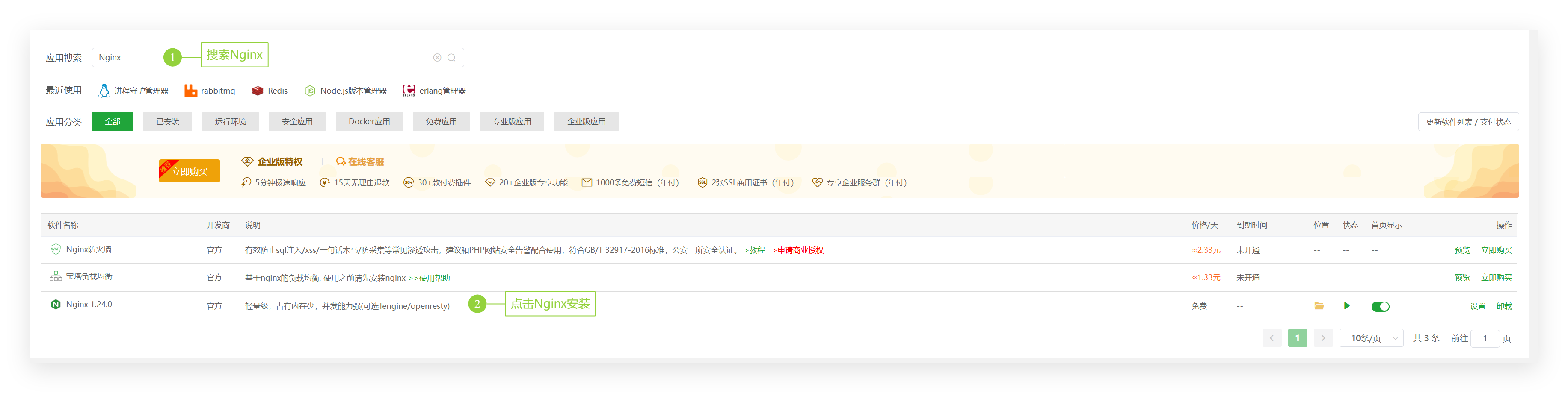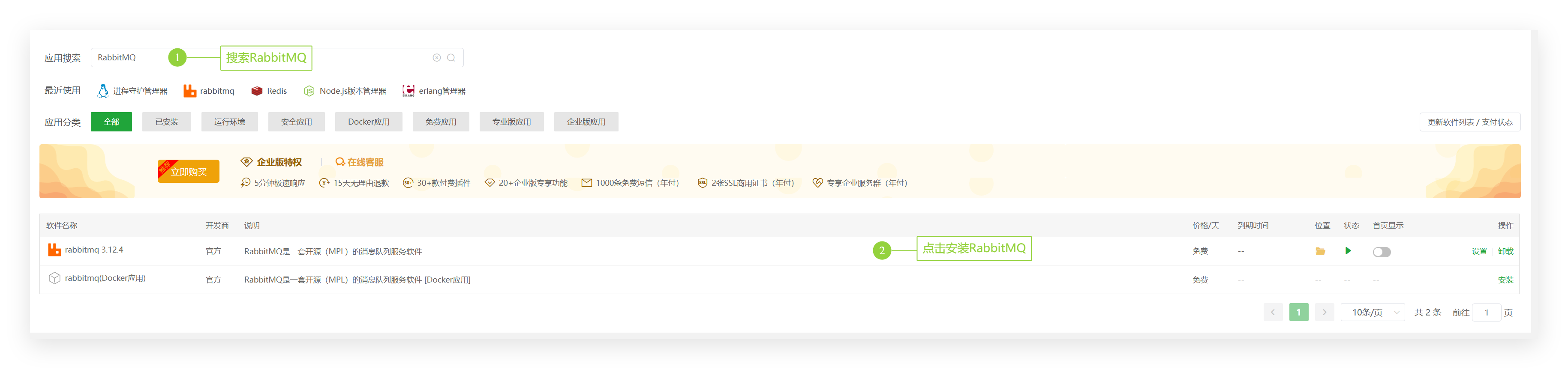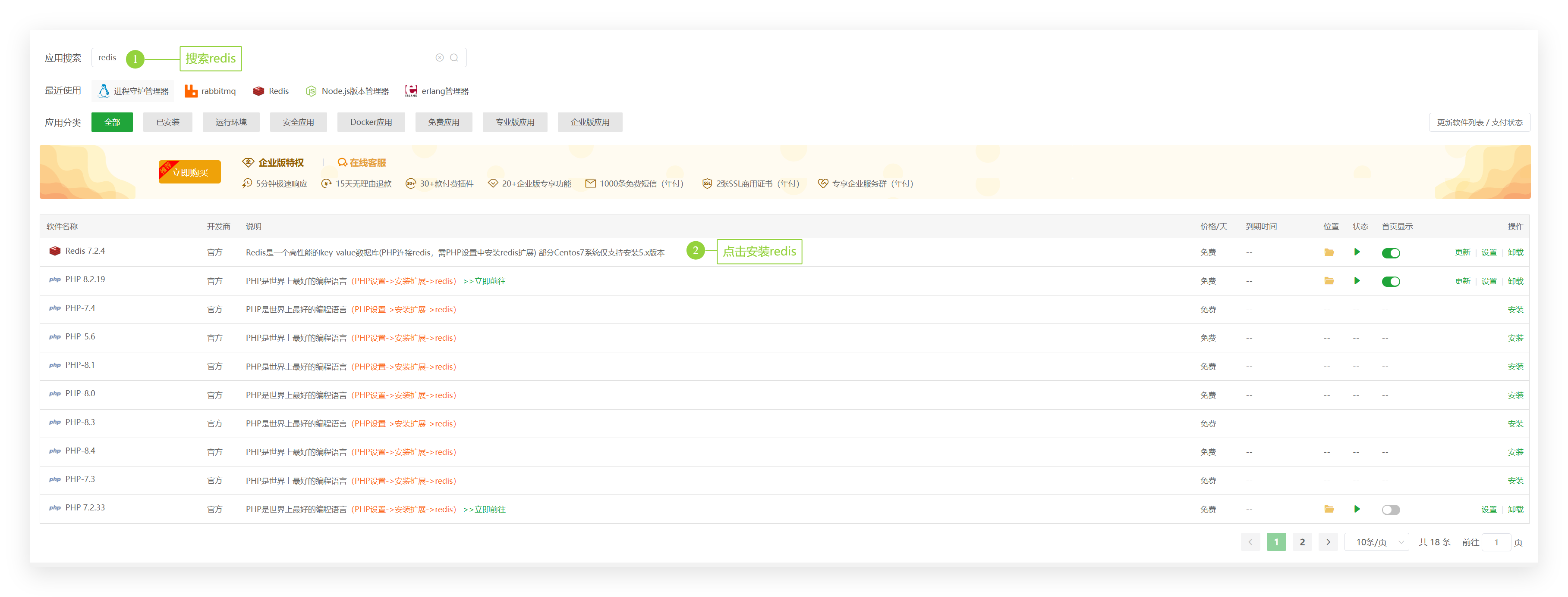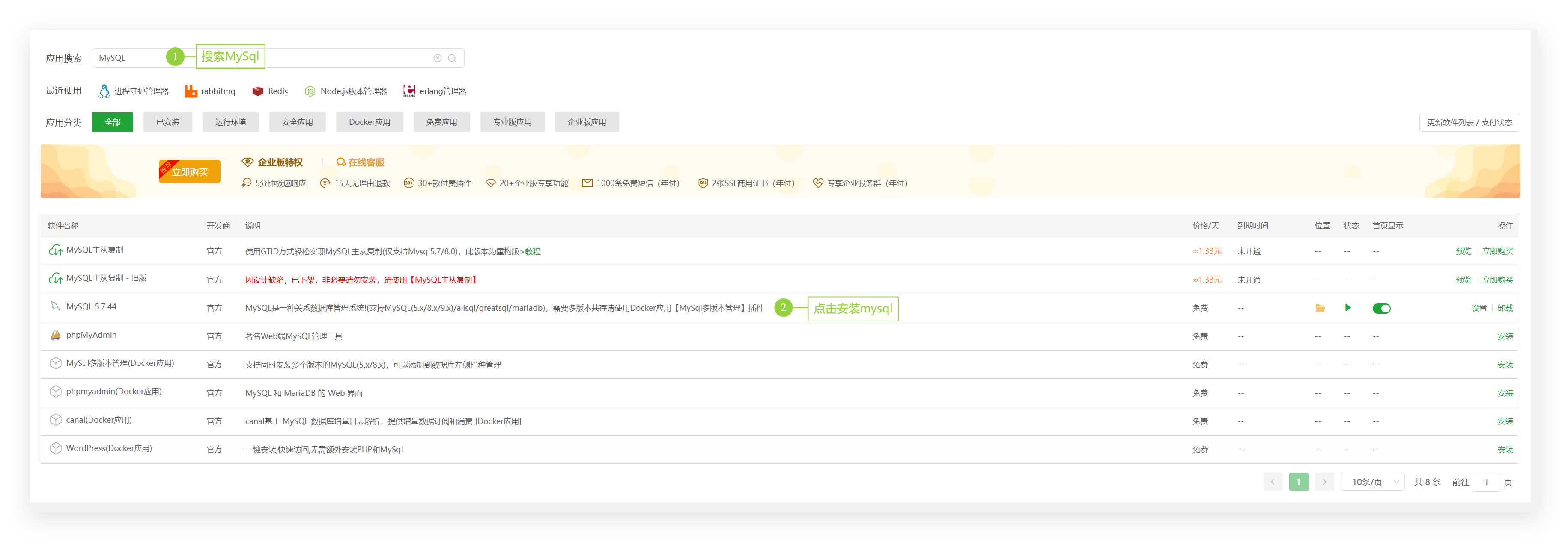 - 点击左侧菜单“软件管理”,安装系统软件:MySQL(选择对应数据库,这里用mysql演示)、Redis(可选)、RabbitMQ(可选)