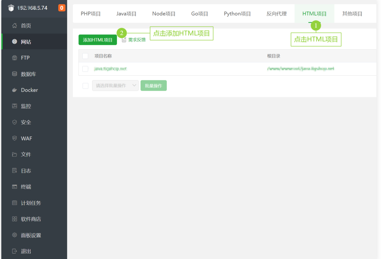 点击左侧菜单“网站”,选择Html项目,点击新建项目
