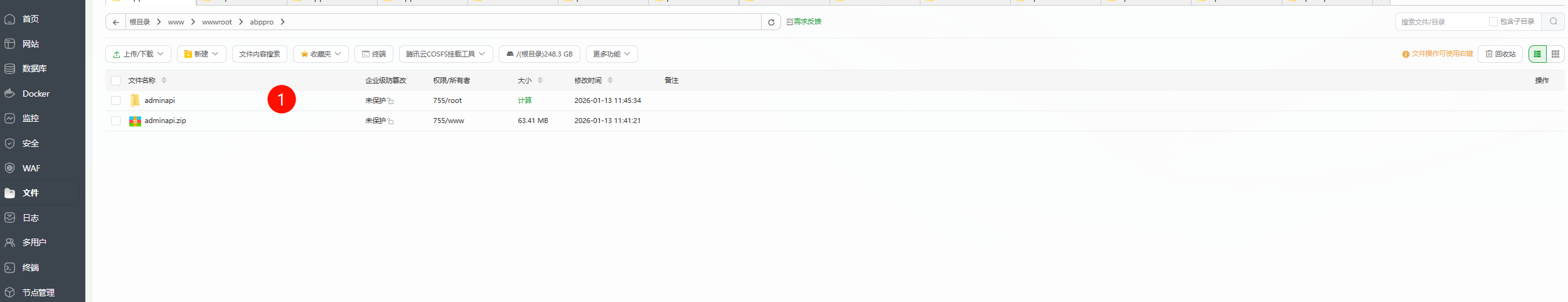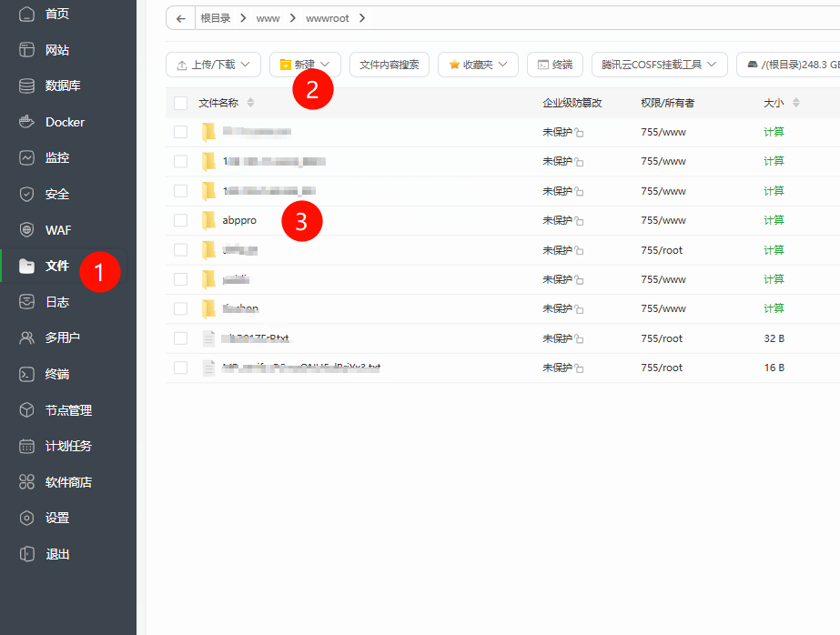 - 点击左侧菜单“文件”,新增目录/www/wwwroot/abppro