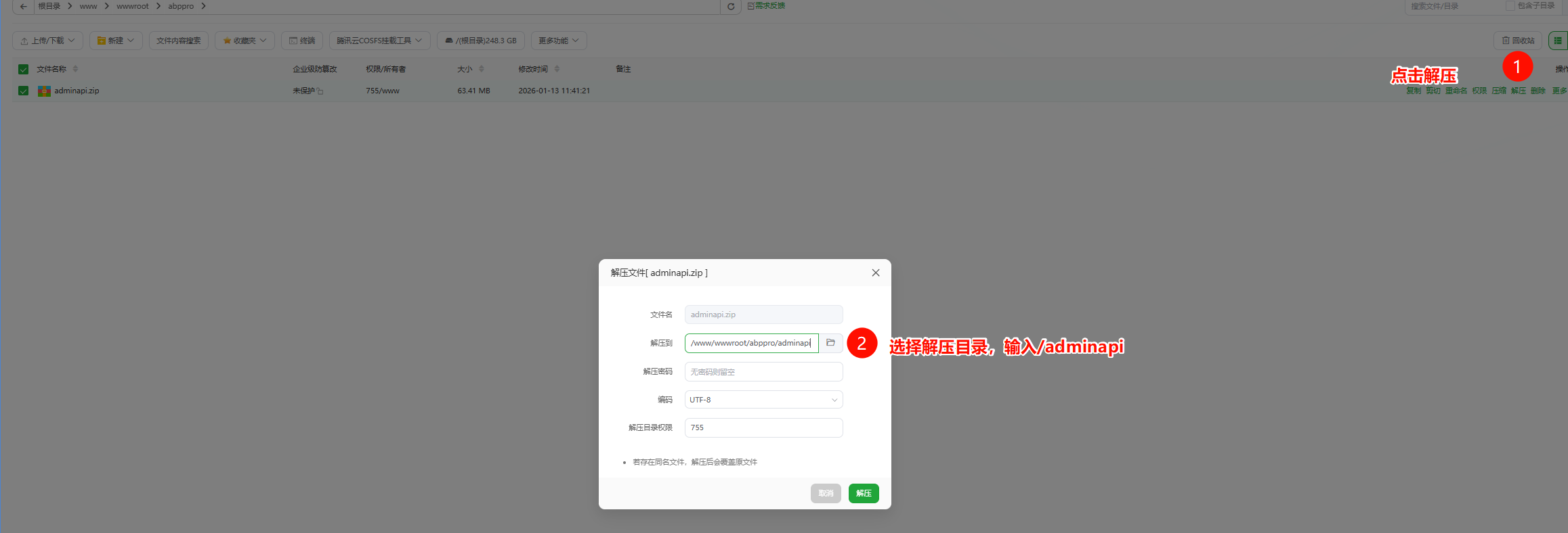 - 上传amdinapi.zip,在执行解压